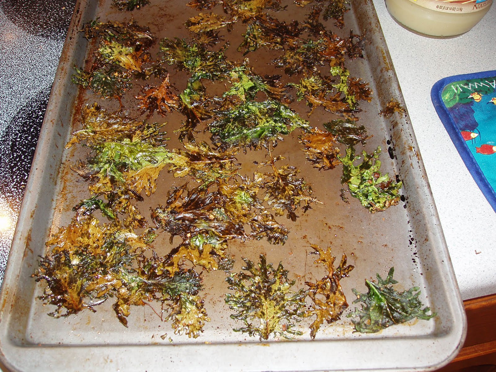 The curly leaf kale wasn't all crispy, so I left it in for a few more minutes. I'm not sure how much the different cookie sheets affected the outcomes, but I'm sure the stoneware slowed the cooking time on the curly leaf kale.